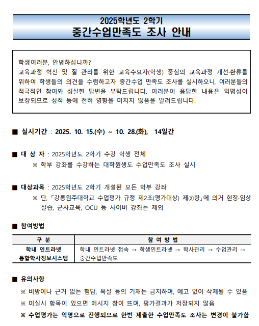 [2025학년도 2학기 중간 수업만족도(수업평가) 조사 시행 안내]
