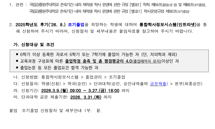 2025학년도 후기('26.8) 조기졸업 신청 안내