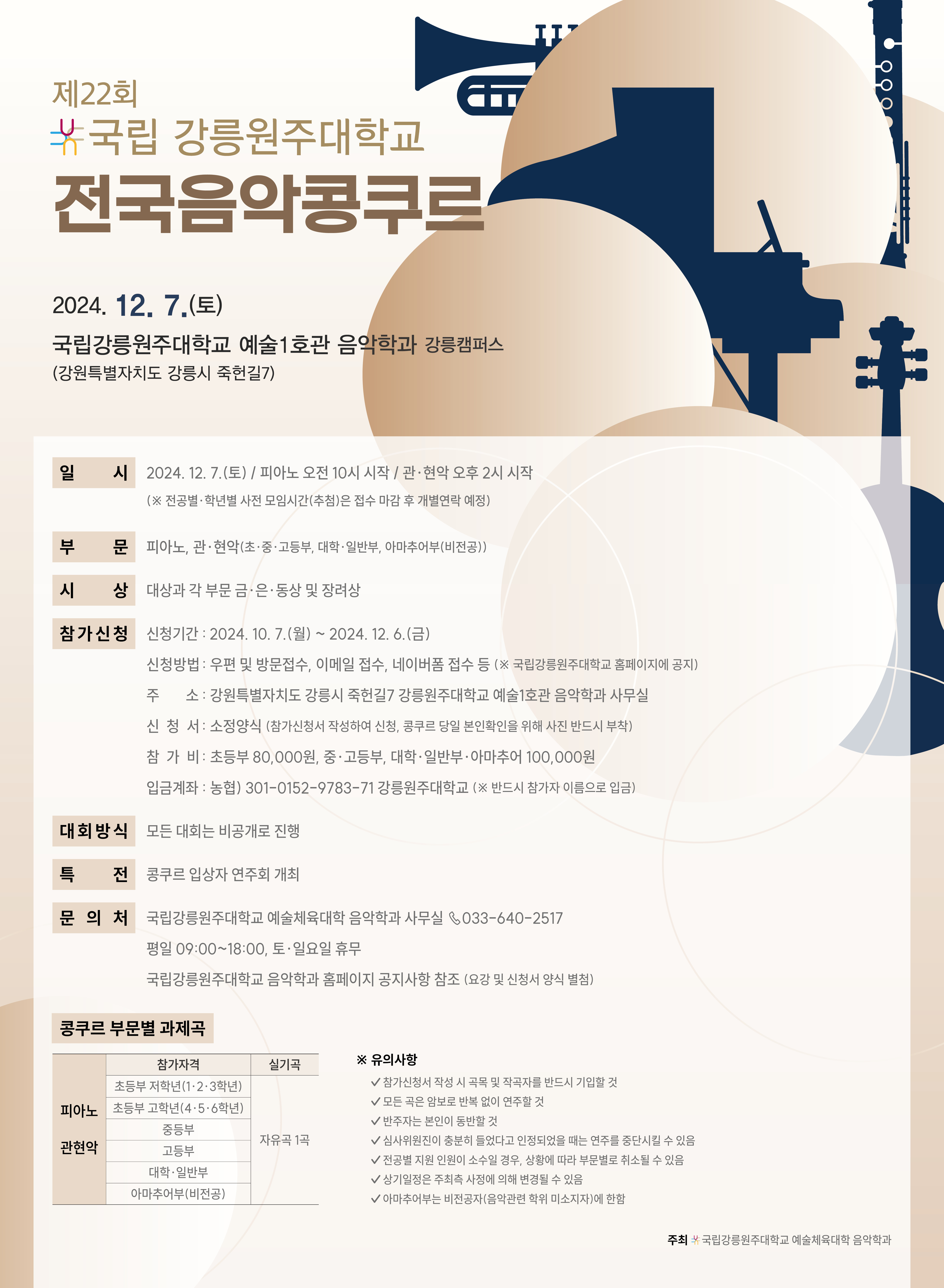 콩쿠르 관련 문의사항은 학과사무실로 연락 바라며, 많은 지원 바랍니다.