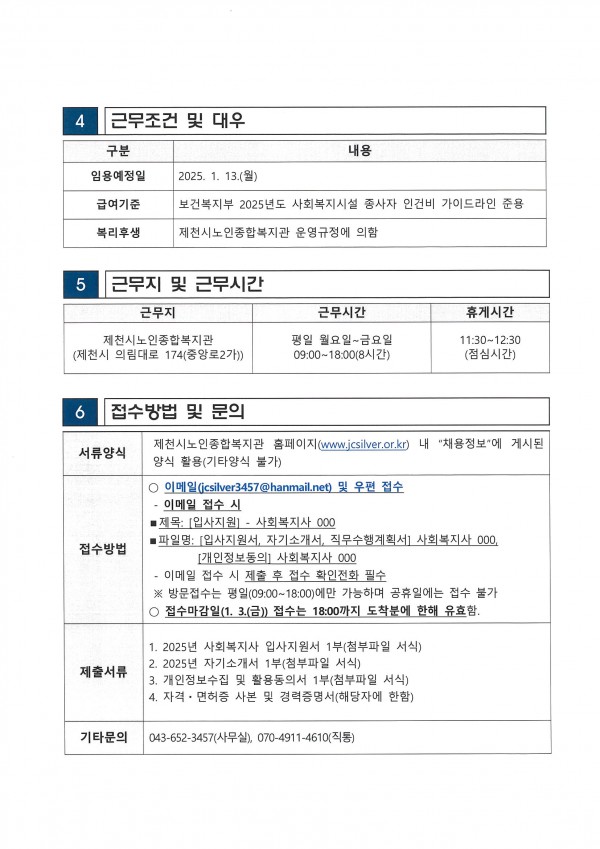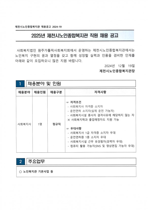 제천시노인종합복지관 직원(사회복지사) 채용 공고
