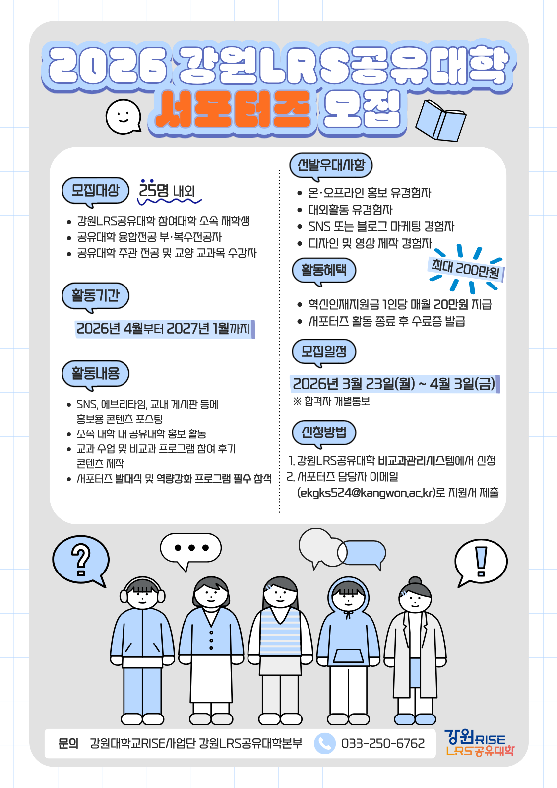 fnctId=bbs,fnctNo=804 [강원대학교RISE사업단 강원LRS공유대학본부] 2026 강원LRS공유대학 서포터즈 모집 안내 작성일 2026.03.27 작성자 김혜리 조회수 89 첨부파일 [붙임1] 2026 강원LRS공유대학 서포터즈 모집 공고 및 지원서식.hwp