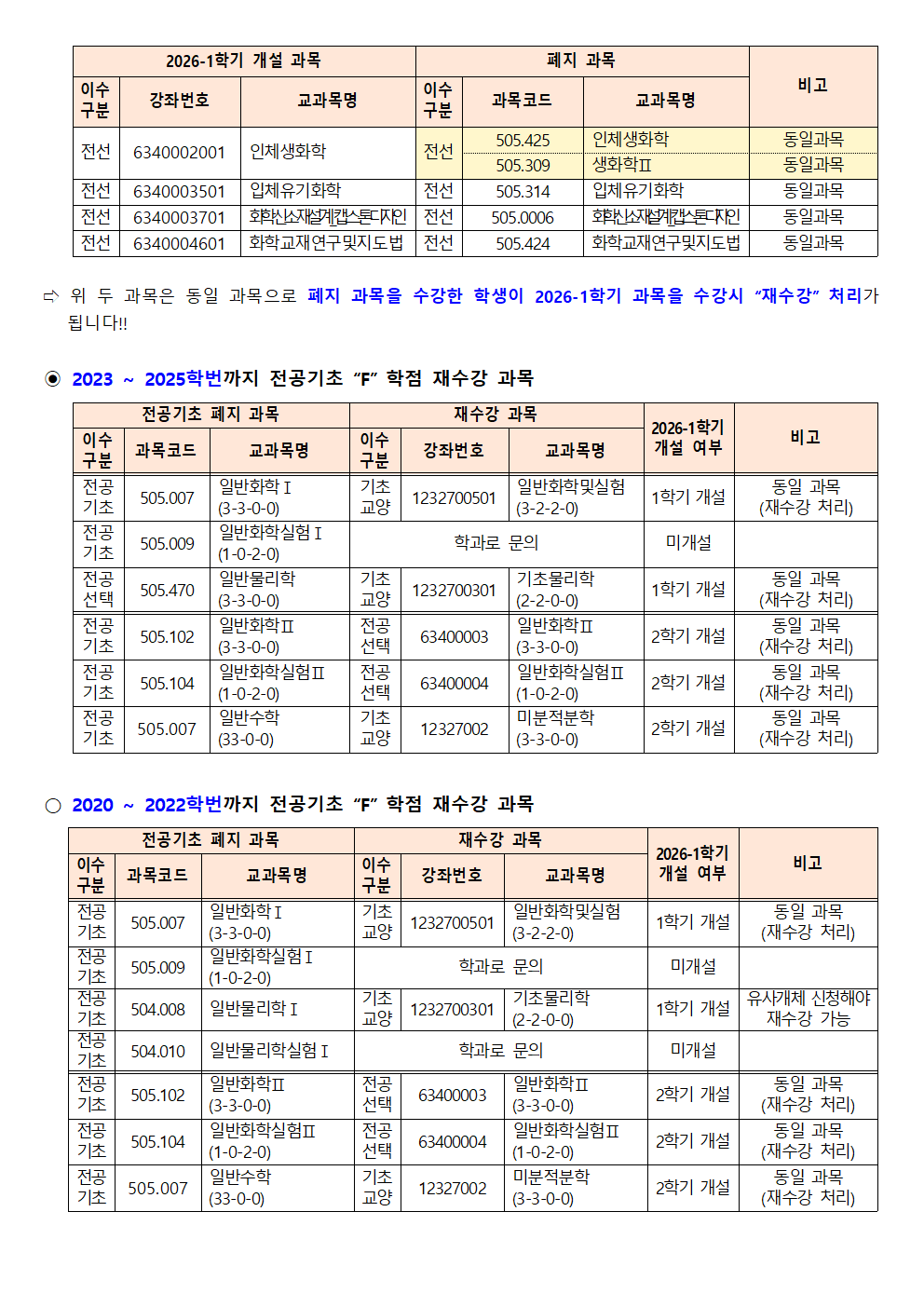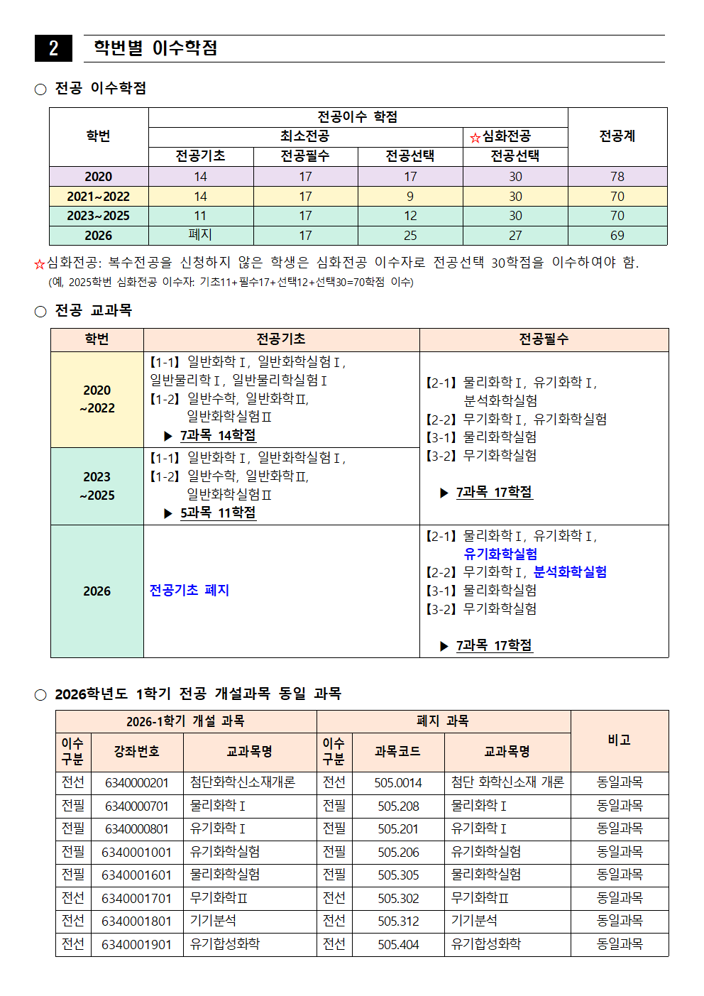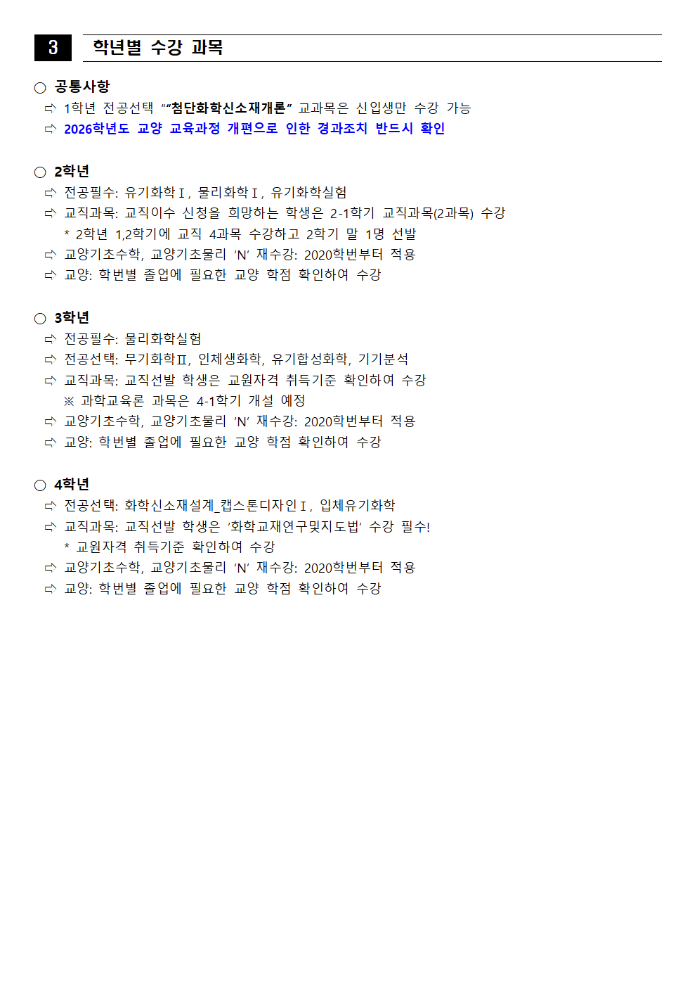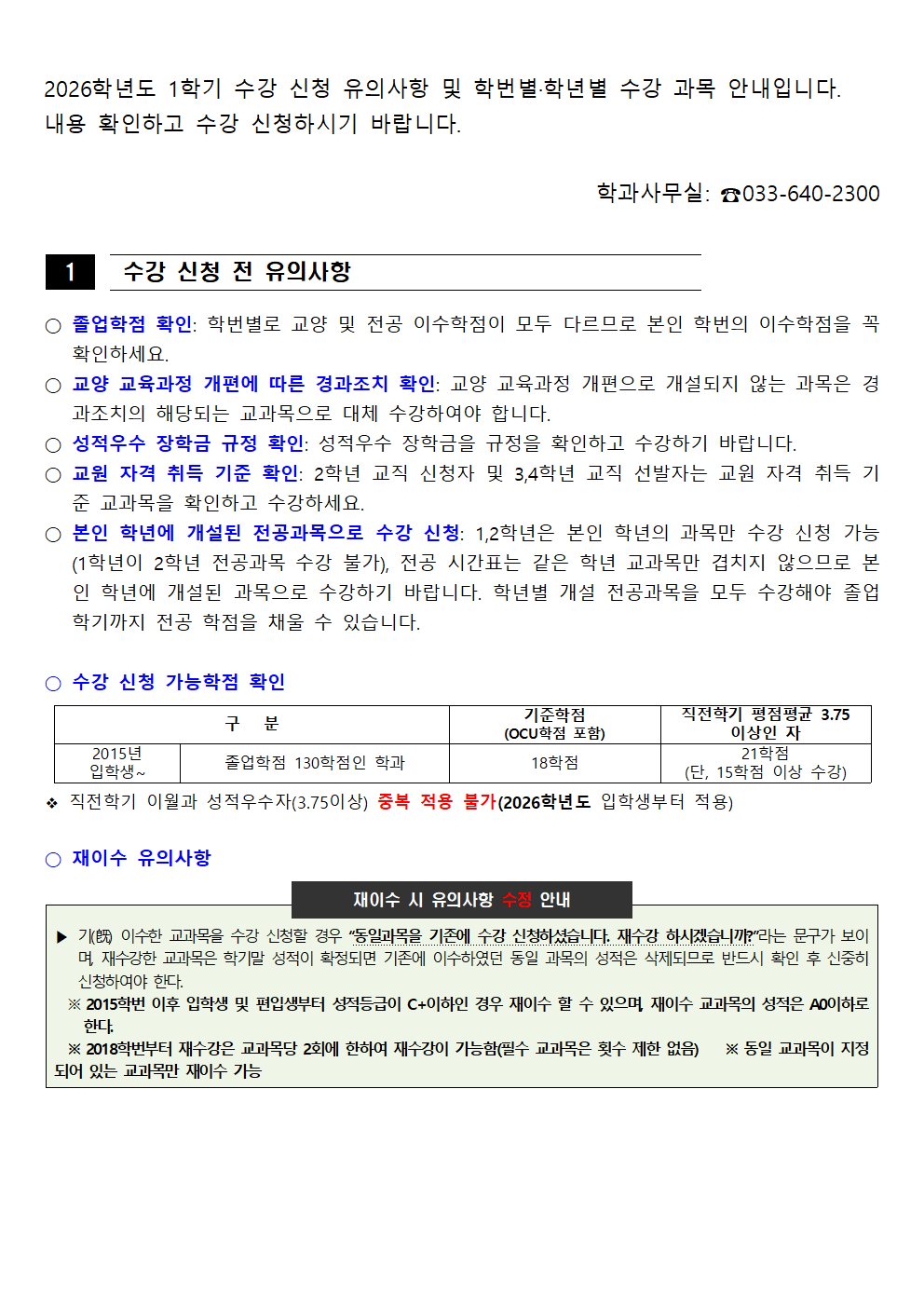 fnctId=bbs,fnctNo=562 [학부] 2026학년도 1학기 학년별 수강학신청 안내 작성일 2026.02.18 작성자 진미영 조회수 932 첨부파일 1. (2020~2025학번) 교육과정 이수기준표.pdf 4. 장학금 규정(학과).pdf 3. (2019~2024학번) 강릉원주대학교 비교과 활동 졸업인증 운영 규정.hwp 0. 2026학년도 1학기 교육과정 수강편람(최종).pdf 2. (교직이수자) 교원자격 무시험검정 합격기준.pdf