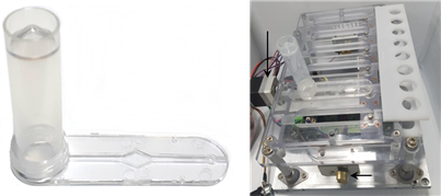 - 기체 발생 반응을 이용하여 눈으로 관측할 수 있는 volumetric biochip을 개발하였습니다. 이전에 개발된 volumetric biochip들은 기체 부피 측정을 위해 별도의 잉크 마커를 사용하여 불편하고 실용화가 어려웠지만, 우리 연구실에서는 마커를 사용하지 않는 간편한 markerless volumetric biochip을 개발하였습니다. 이 biochip에서 피펫만을 이용하여 10개 이하의 식중독균을 검출할 수 있었습니다.