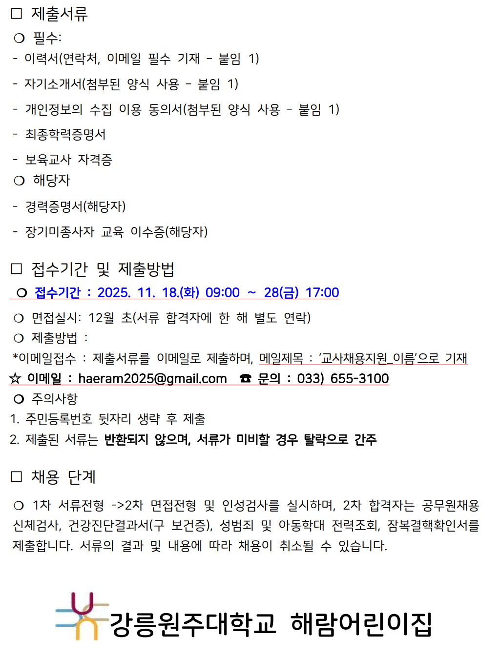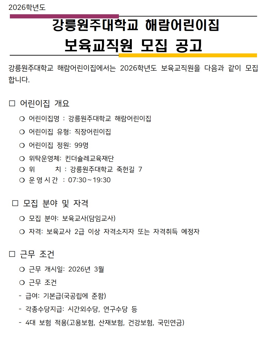 fnctId=bbs,fnctNo=208 강릉원주대학교 해람어린이집 보육교직원 모집 공고 작성일 2025.11.17 작성자 신시원 조회수 1715 첨부파일 해람_교사채용지원양식.hwp 다음글 강원특별자치도자연학습원 직원 공개 채용 신시원 2026-01-12 10:57:21.0 이전글 해군1함대 사랑Dream 어린이집 교직원 채용 신시원 2025-11-10 14:40:03.0 총 17 개의 게시물이 있습니다. 게시물 검색 제목 작성자 게시글 리스트 취업정보 번호 제목 작성자 작성일 댓글 조회수 첨부파일 17 한라소담 어린이집 정교사 모집 공고 신시원 2026.03.09 0 684 0 16 강원특별자치도자연학습원 직원 공개 채용 신시원 2026.01.12 0 1216 1 15 강릉원주대학교 해람어린이집 보육교직원 모집 공고 신시원 2025.11.17 0 1715 1 14 해군1함대 사랑Dream 어린이집 교직원 채용 신시원 2025.11.10 0 1438 0 13 2025학년도 봉대초등학교병설유치원 하계 방학 중 방과후과정 인력 채용 공고 신시원 2025.06.20 0 2802 0 12 하이원 정선 어린이집(강원랜드 직장어린이집(한솔보육재단)) 보육교사 채용 공고 신시원 2024.07.17 0 6451 0 11 <원주소방서어린이집 담임교사 구인> 신시원 2024.03.11 0 6410 0 10 근로복지공단 동해어린이집 보육교직원 채용 공고 신시원 2023.11.24 0 4614 0 9 푸른자연 유치원 교사 구인 안내 신시원 2023.08.14 0 2286 0 8 2023년 강릉원주대학교 해람어린이집 교사 채용공고 신시원 2022.12.14 0 2743 2 처음 12 1 2 다음 페이지 끝