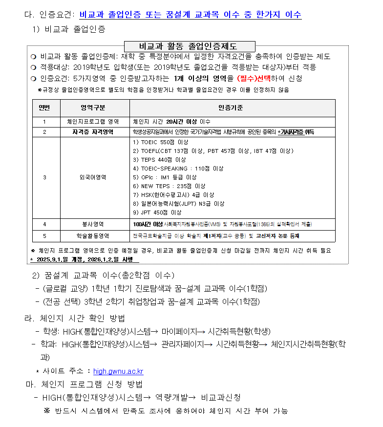 fnctId=bbs,fnctNo=642 2026학년도 비교과 활동 졸업인증제 시행 알림 작성일 2026.03.30 작성자 노종민 조회수 31 첨부파일 2026학년도 비교과 활동 졸업인증제 시행 알림.pdf 국립강릉원주대학교 비교과 활동 졸업인증 운영 규정.pdf