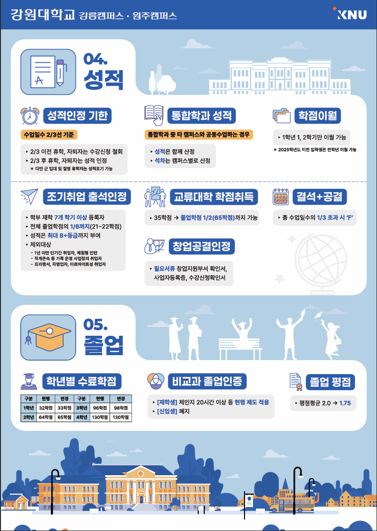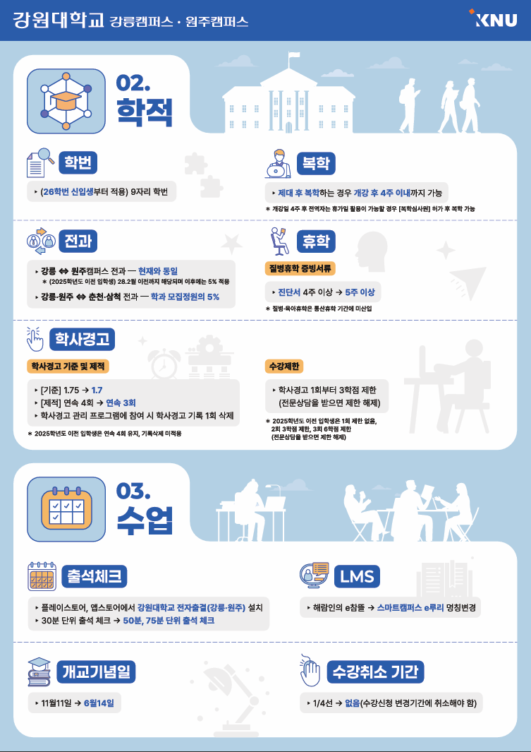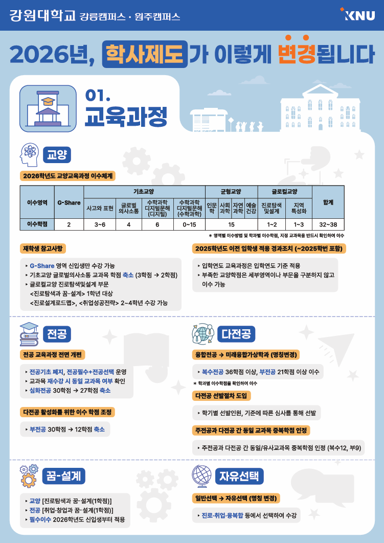 fnctId=bbs,fnctNo=880 통합 강원대학교 교육과정 및 학사제도 안내 인포그래픽 배포 작성일 2026.02.27 작성자 홍승연 조회수 790 첨부파일 첨부파일이(가) 없습니다.