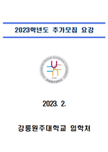 2026학년도 추가모집요강 1차 추가 원서접수 : 2026.2.20.(금)10:00~2.25(수)10:00까지 2차 추가 원서접수 : 2026.2.25.(수)16:00~2.26.(목)14:00까지 접수방법 : 인터넷 원서접수 * 3차 추가모집은 1차 및 2차 추가모집 미충원 시 실시 예정 바로보기 다운로드 Kangwon National University 2026 Kangwon National University 2025 2025학년도 신입생 1차 추가모집 요강 바로보기 다운로드 Kangwon National University 2024 2024학년도 신입생 1차 추가모집 요강 바로보기 다운로드 Kangwon National University 2023 2023학년도 신입생 1차 추가모집 요강 바로보기 다운로드 Kangwon National University 2022 2022학년도 신입생 1차 추가모집 요강 바로보기 다운로드 Kangwon National University 2021 2021학년도 신입생 1차 추가모집 요강 바로보기 다운로드 Kangwon National University 2021 2021학년도 신입생 2차 추가모집 요강 바로보기 다운로드 Kangwon National University 2021 2021학년도 신입생 3차 추가모집 요강 바로보기 다운로드