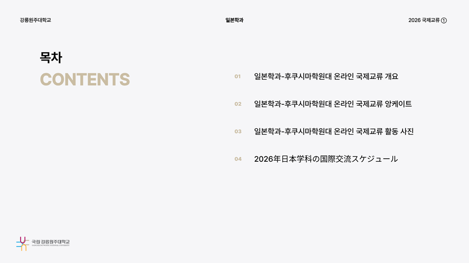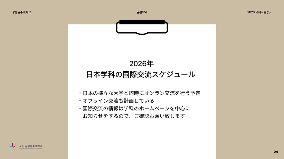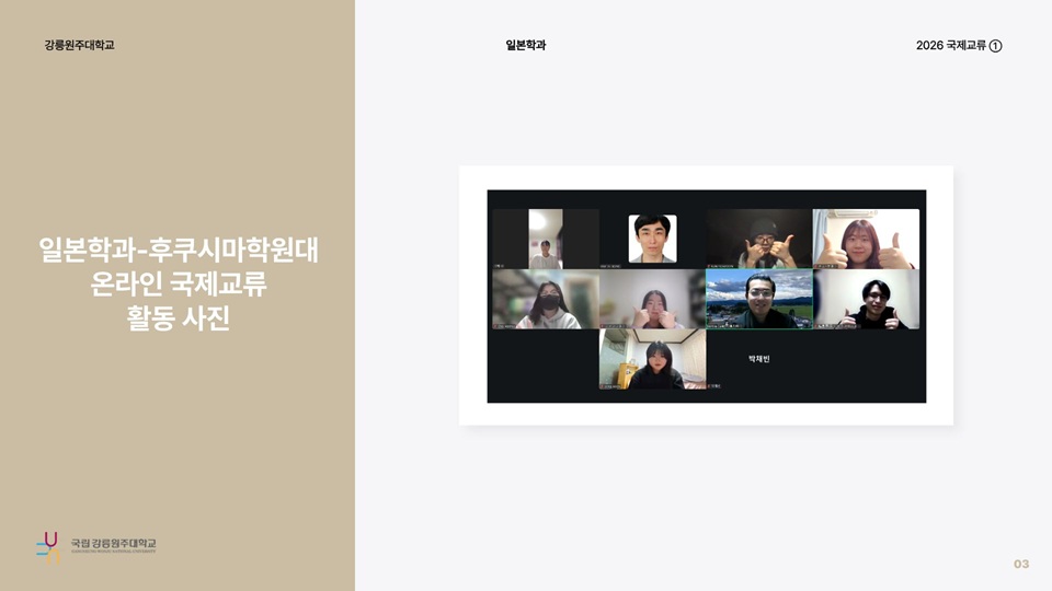 fnctId=bbs,fnctNo=736 [국제교류] 2026 후쿠시마학원대학 온라인 국제교류 보고서 글번호 328196 작성일 2026.03.06 작성자 엄태봉 조회수 527 첨부파일 첨부파일이(가) 없습니다.