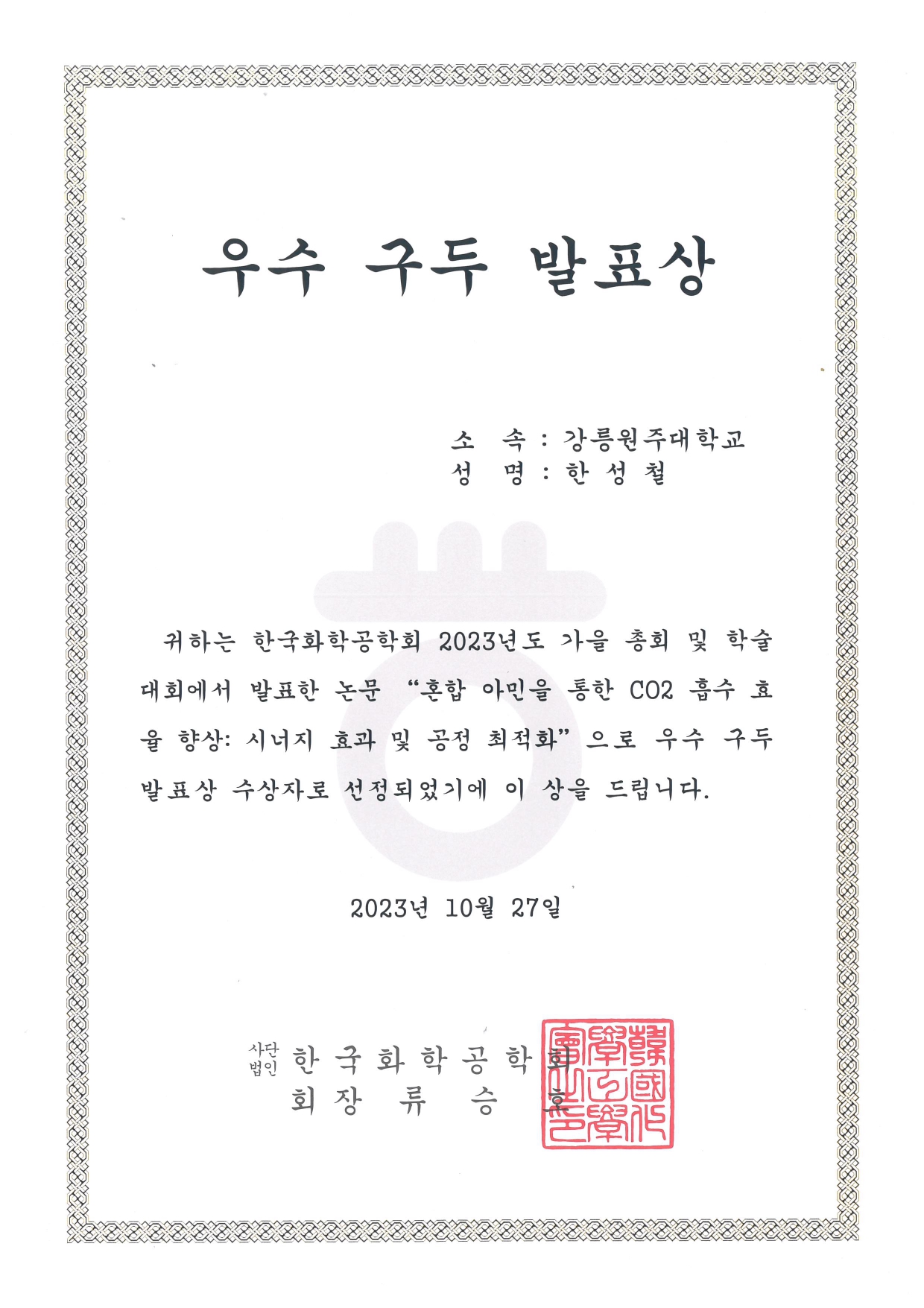 생명화학공학과 한성철 대학원생, 한국화학공학회 구두 발표 학회상 수상생명화학공학과 한성철 대학원생,한국화학공학회 구두 발표 학회상 수상생명화학공학과 대학원생 한성철(지도교수 김경민)이 한국화학공학회에서 주최한 2023년도 가을 총회 및 학술대회 우2024.01.05 -