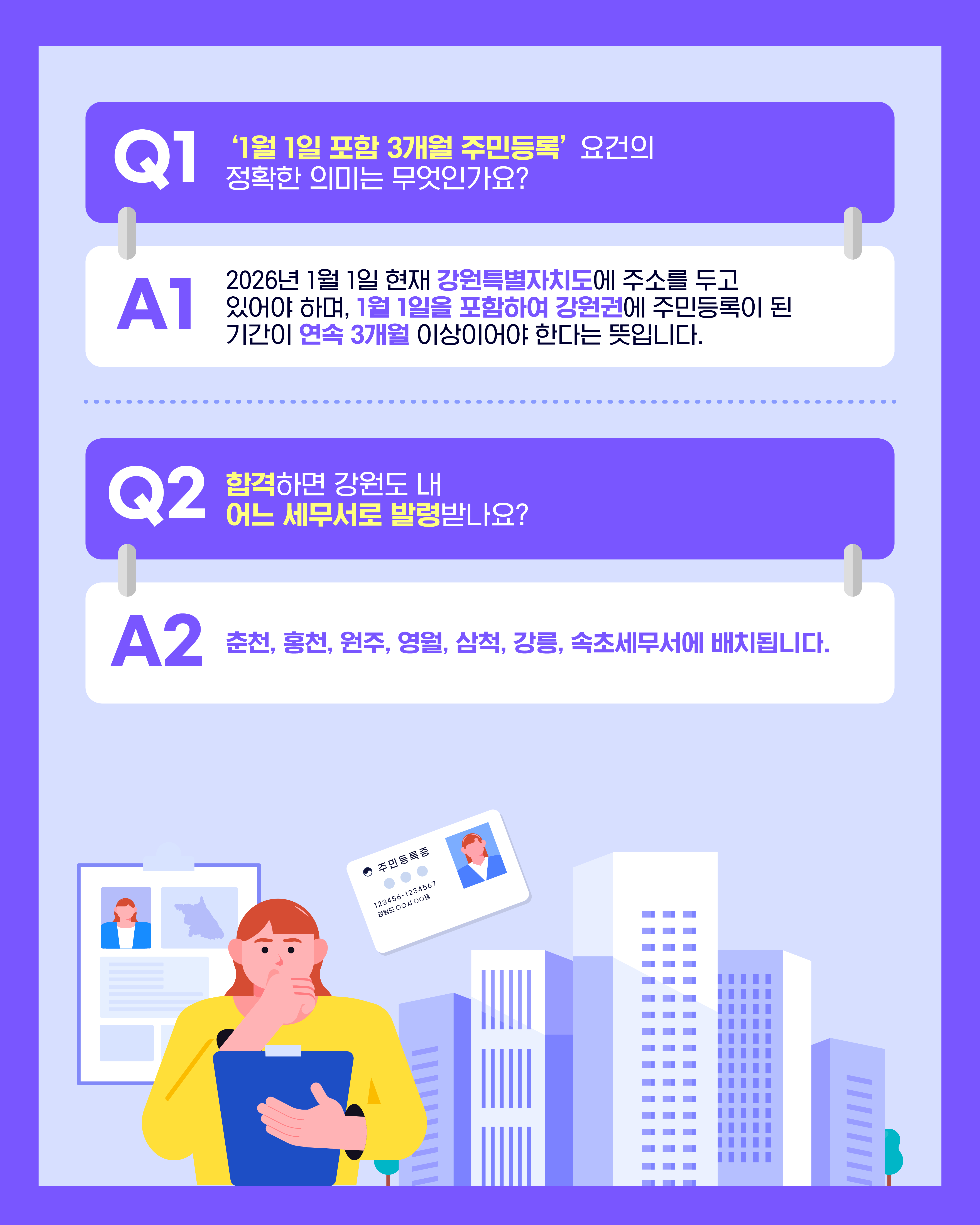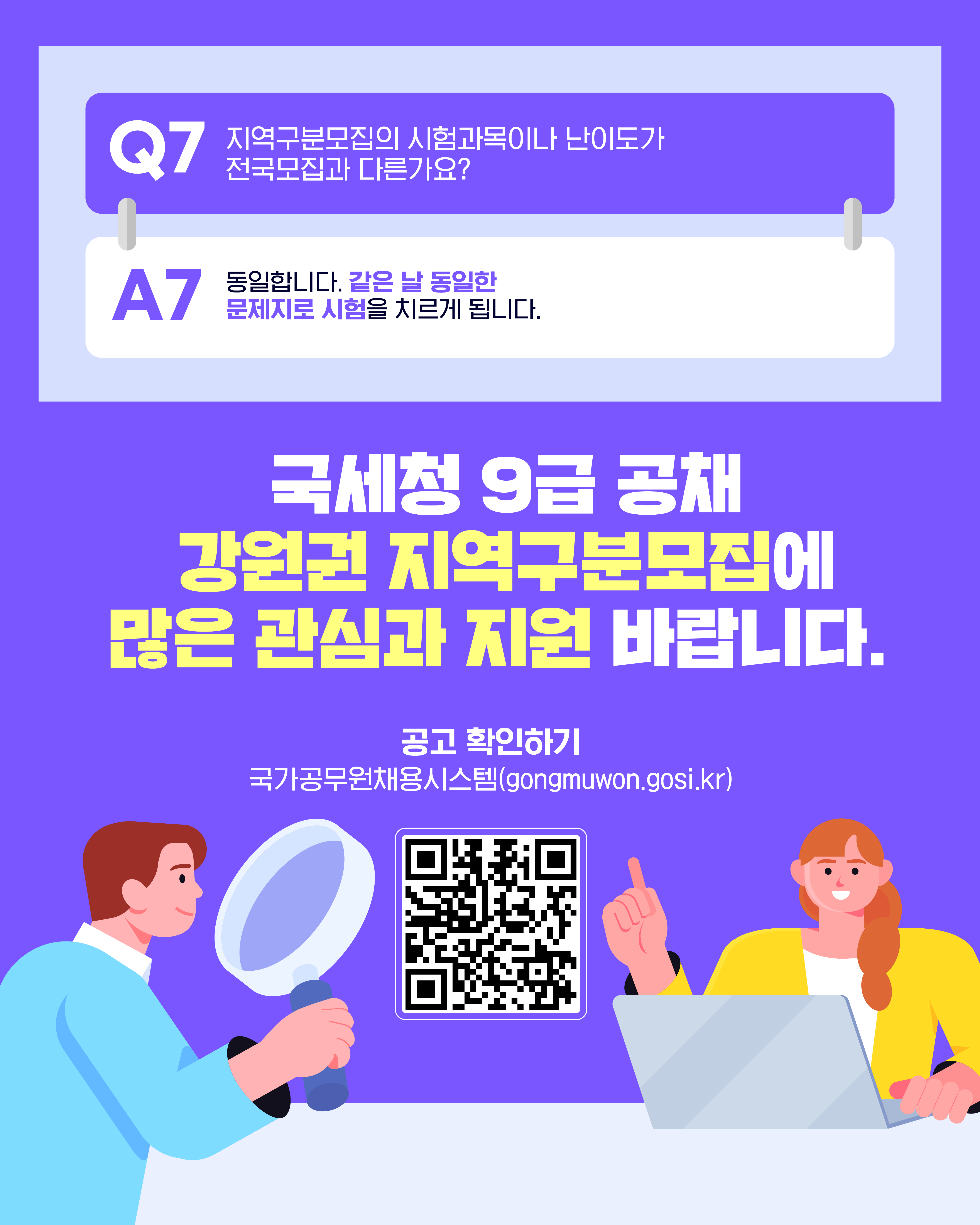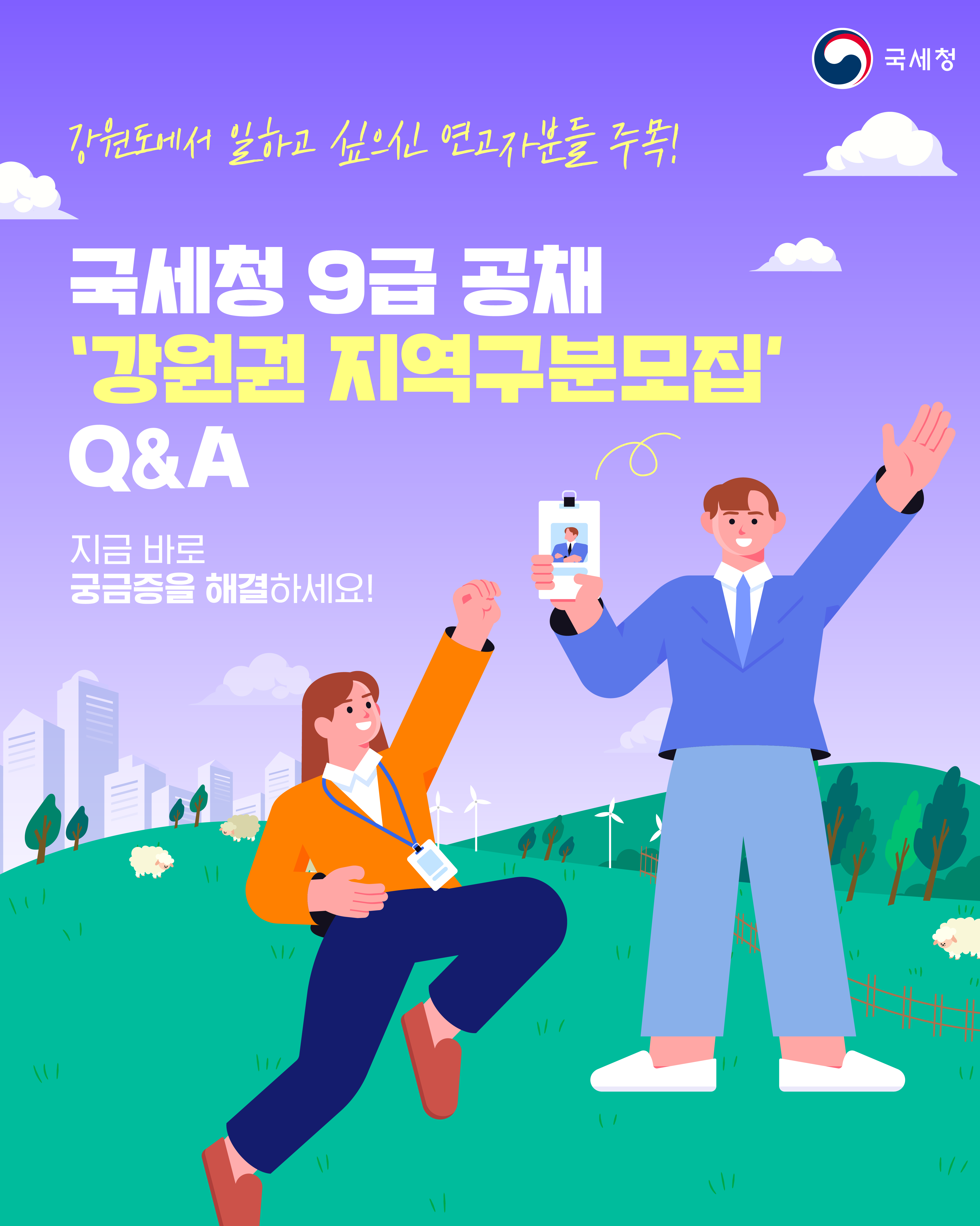 fnctId=bbs,fnctNo=1046 국세청 9급 공채 강원도 지역구분 모집 안내 작성일 2026.01.19 작성자 학생성공지원과 조회수 969 첨부파일 첨부파일이(가) 없습니다.