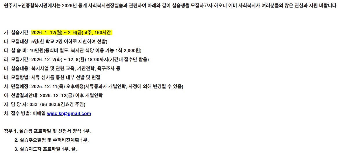 fnctId=bbs,fnctNo=849 [2026-동계] 원주시노인종합복지관 실습생 모집 안내(~12/8) 작성일 2025.11.28 작성자 박아름 조회수 947 첨부파일 원주시노인종합복지관 2026년 동계 사회복지현장실습 첨부파일.hwp